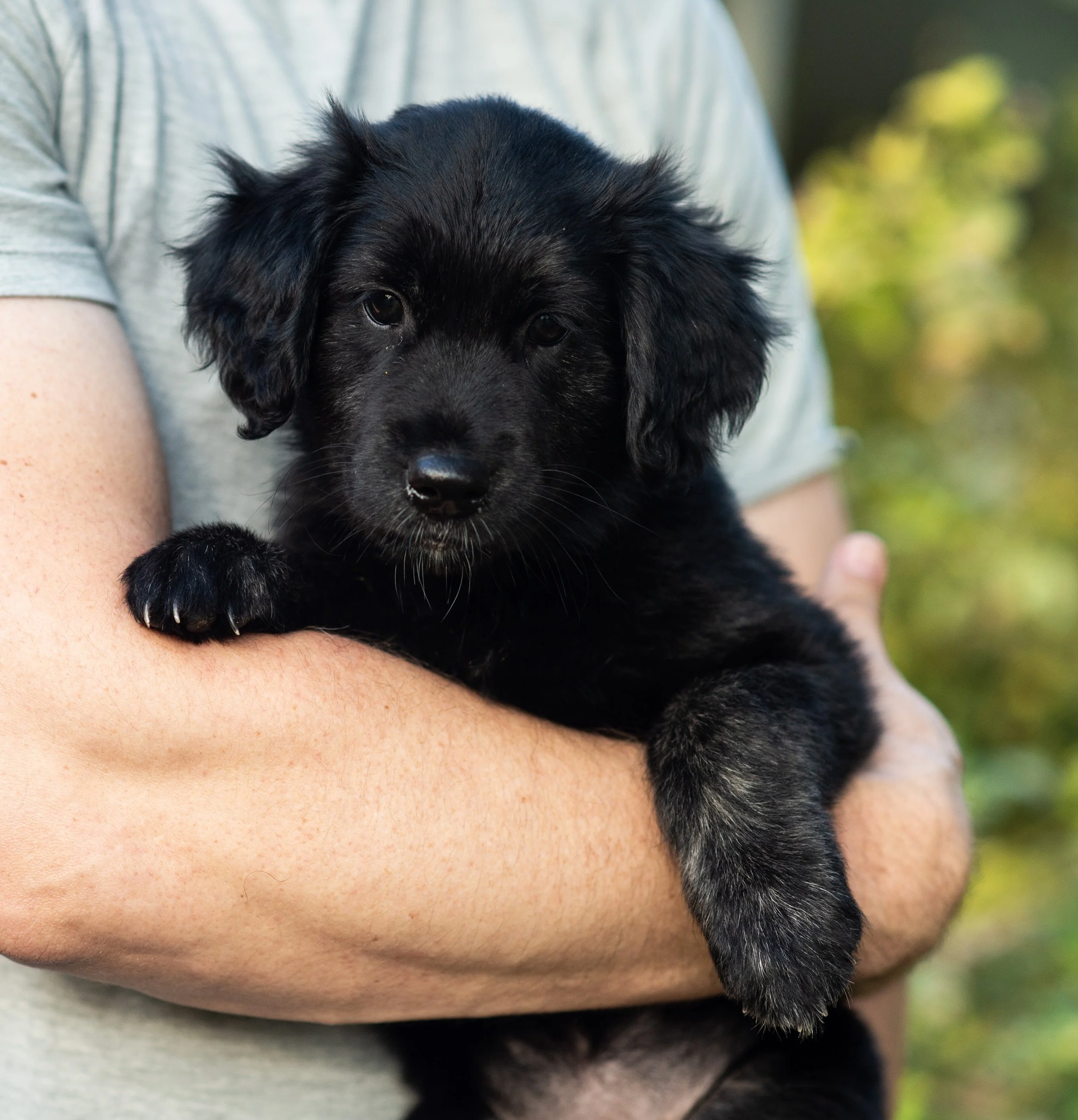 His stunning appearance is just as memorable as his temperament: with soulful brown eyes, a sleek, mostly black coat accented with soft brindle touches on his paws and chest, plus delicate splashes of white on his face, chest, and back feet. We expect Alan to grow into a beautifully flat-coated adult with a graceful, polished look.